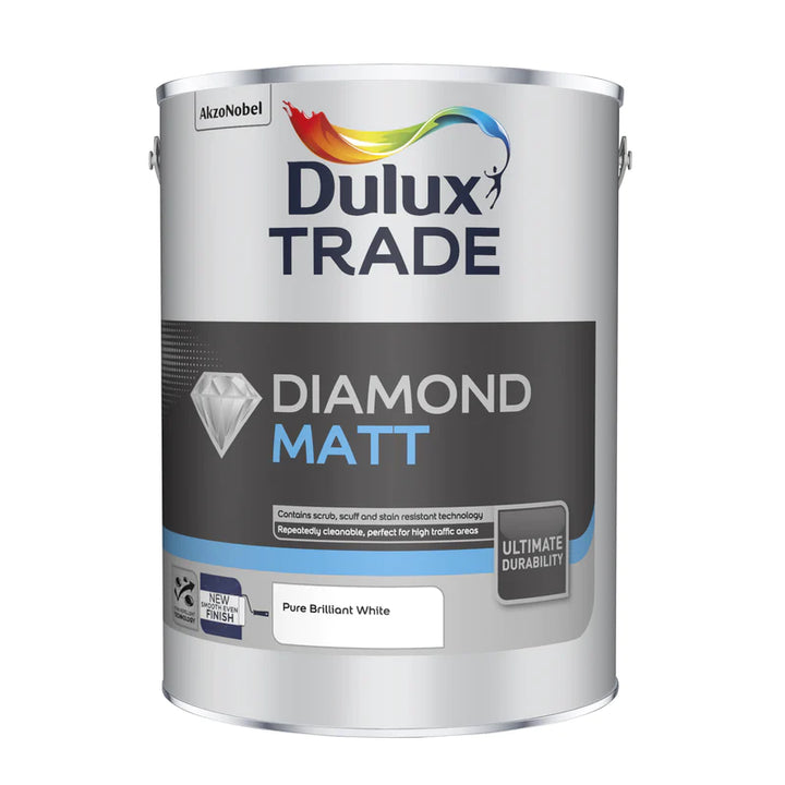Dulux Washable Diamond Matt - A tough, washable matt emulsion with 10 times the durability of silk emulsions. It is resistant to many common stains and will wipe clean. Diamond Matt is a tough and cleanable emulsion with a smooth, even matt finish. It's perfect for busy environments that require frequent cleaning as it contains unique Stain Repellent Technology, preventing stains from setting in to the surface and making cleaning up easier. It also protects against common scuffs. For use on interior walls and ceilings.