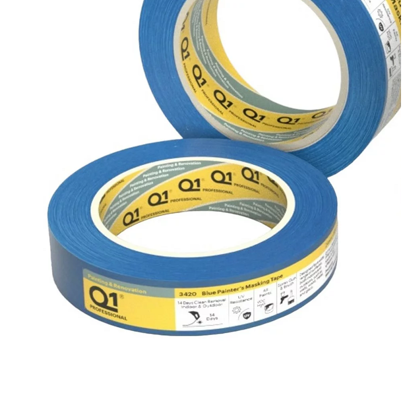 The Q1 Blue Painter's 1 Inch Masking Tape is a high quality professional blue masking tape with a natural rubber adhesive for strong bonding and clean removal up to 14 days.